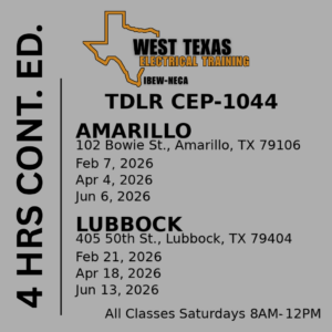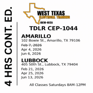IBEW Local 602 is offering Saturday continuing education classes in Amarillo and Lubbock throughout early 2026. Each session runs 8:00 AM–12:00 PM and provides 4 hours of TDLR credit upon completion. The course also covers updates to the National Electrical Code and is open to members who want to stay current, even if they do not hold a TDLR electrical license.